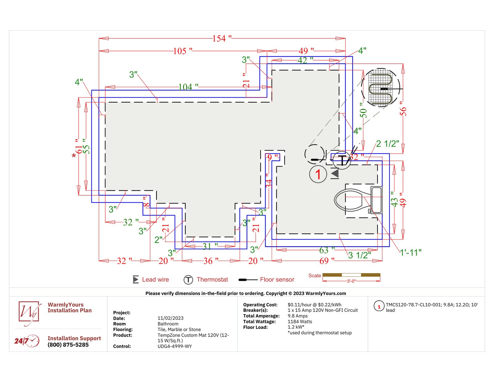 The mats feature a layered construction with the heating element sandwiched between two durable layers of fabric. WarmlyYours will help you design the perfect floor-heating system with free overnight design services. Each custom mat is made to order and is non-refundable.